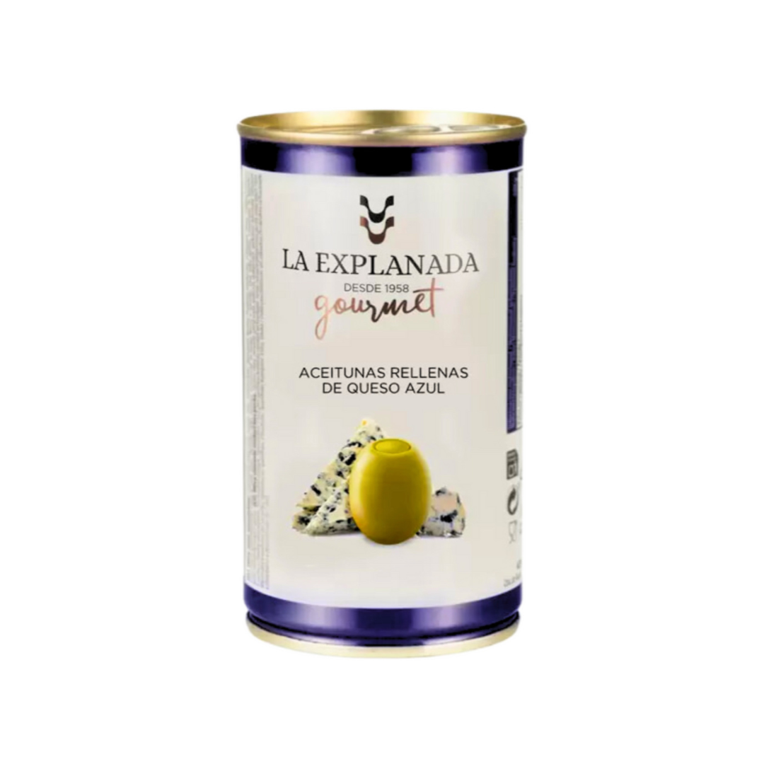 La Explanada’s blue cheese stuffed olives masterfully combine the softness and fleshiness of Manzanilla olives with the intensity and character of blue cheese, achieving a sophisticated snack full of flavour. Carefully selected, these olives stand out for their firm texture and creamy filling, where the blue cheese adds an unmistakable touch. The perfect balance between the light acidity of the olives and the potency of the cheese makes this blend an ideal aperitif for lovers of intense flavours.